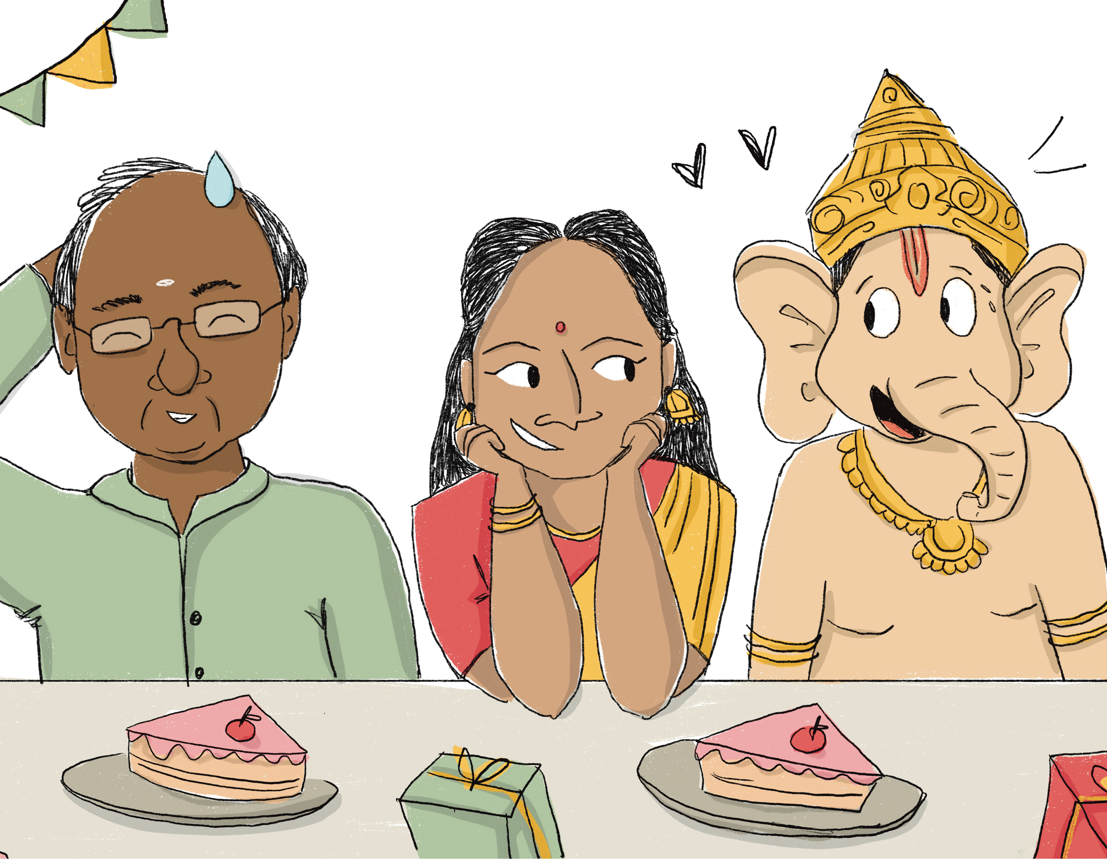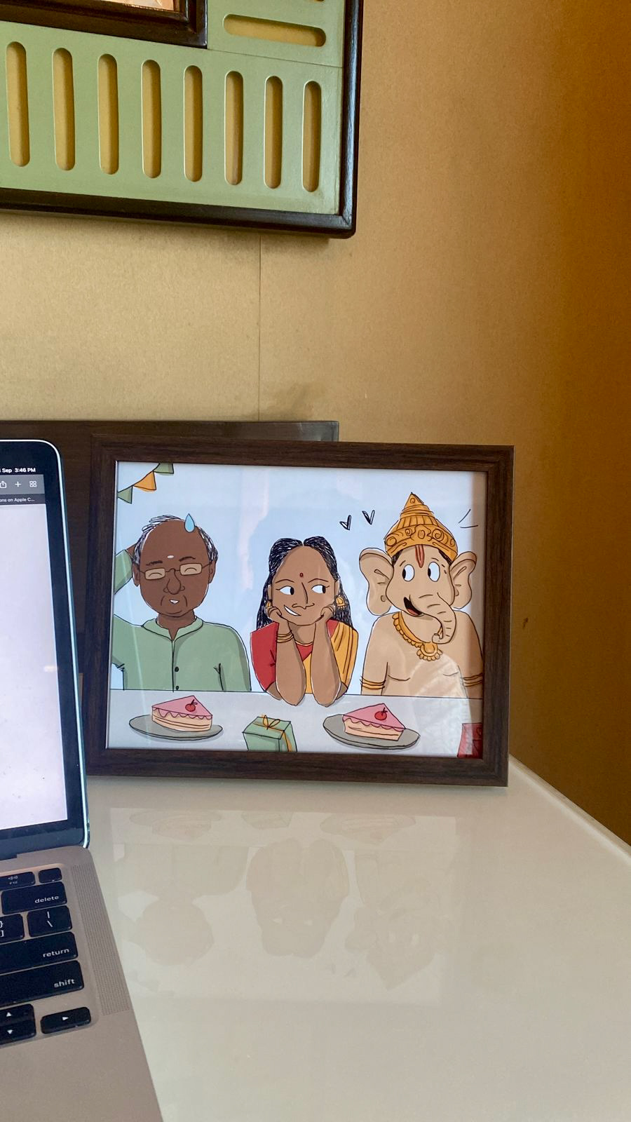 Caricature and illustration for a 25th anniversary. Among the many details about the doting couple, I chose to highlight the wife's love for Lord Ganesha, adding a humorous touch to their celebration.