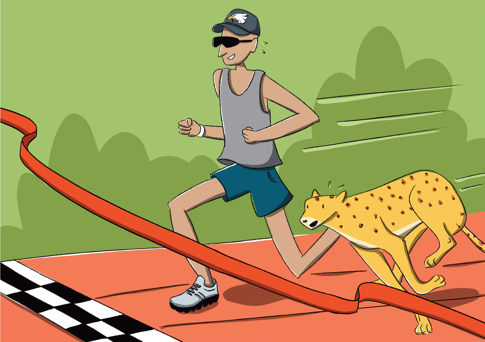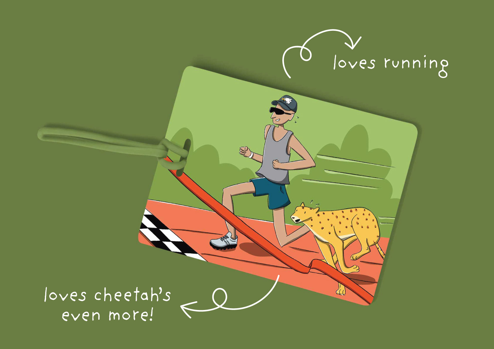 Caricature and Illustration for a custom luggage tag commissioned as a birthday gift. Brief included two things along with a physical description : Loves running and loves cheetah's even more.
